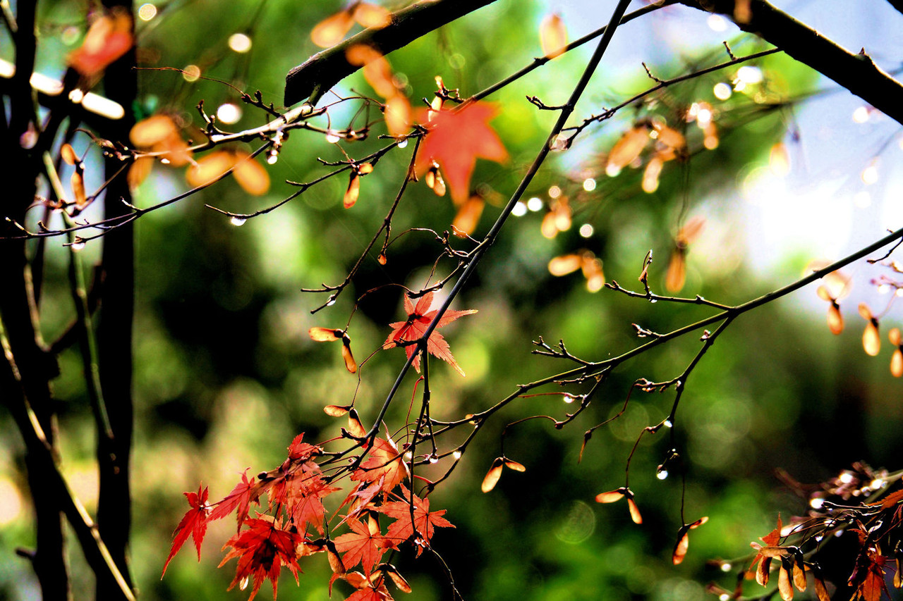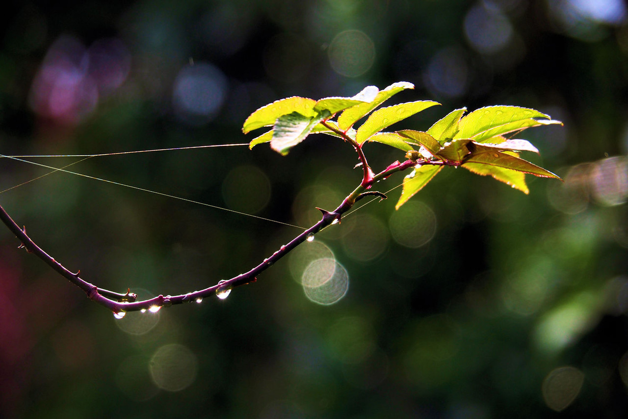 朝食を摂って7時半頃、太陽はかなり高くなって木々に残った雨粒が宝石の様に輝いていました。
