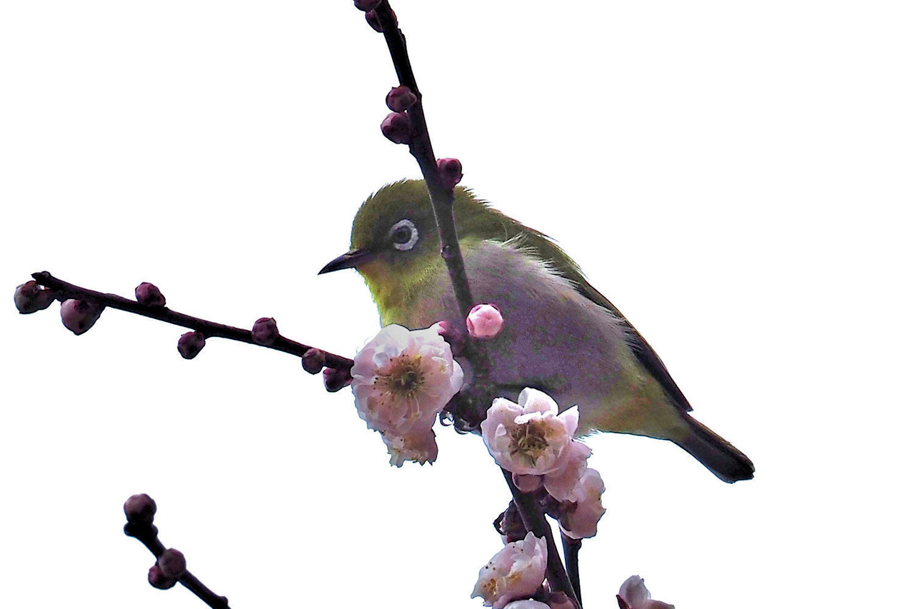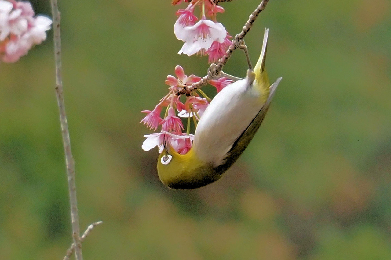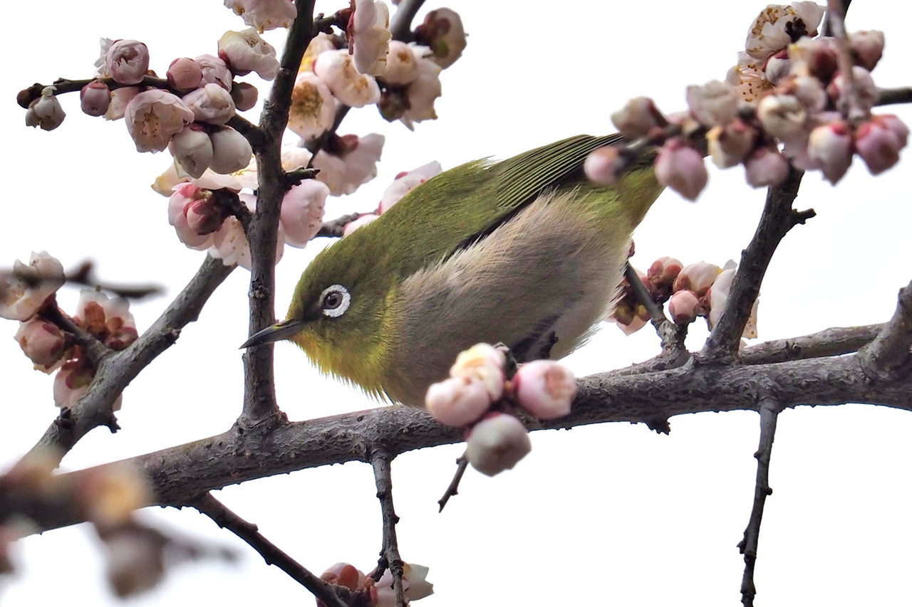 望遠レンズを通して見えるメジロの愛くるしい姿に癒されながらの撮影です。