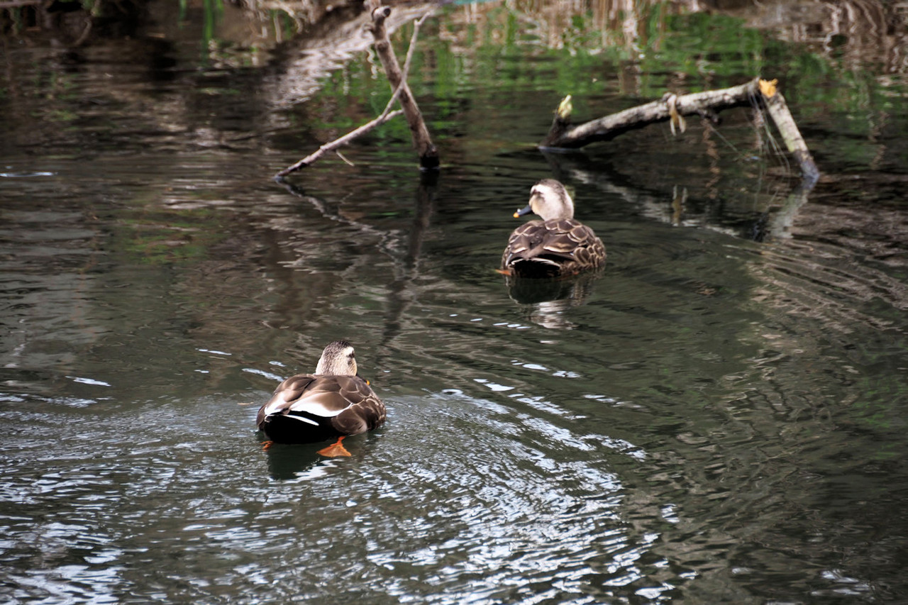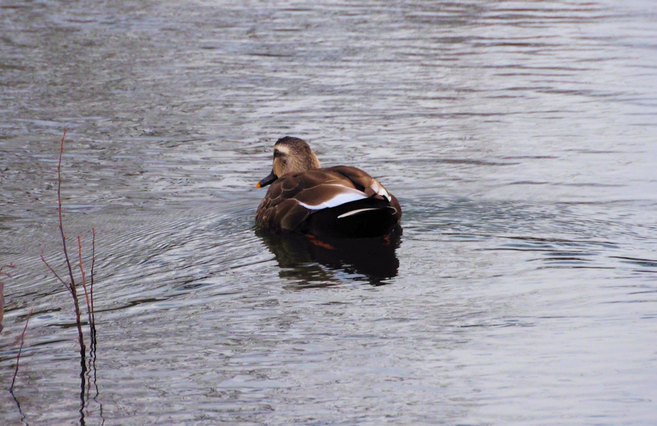 一羽のカルガモが入り江で餌探し