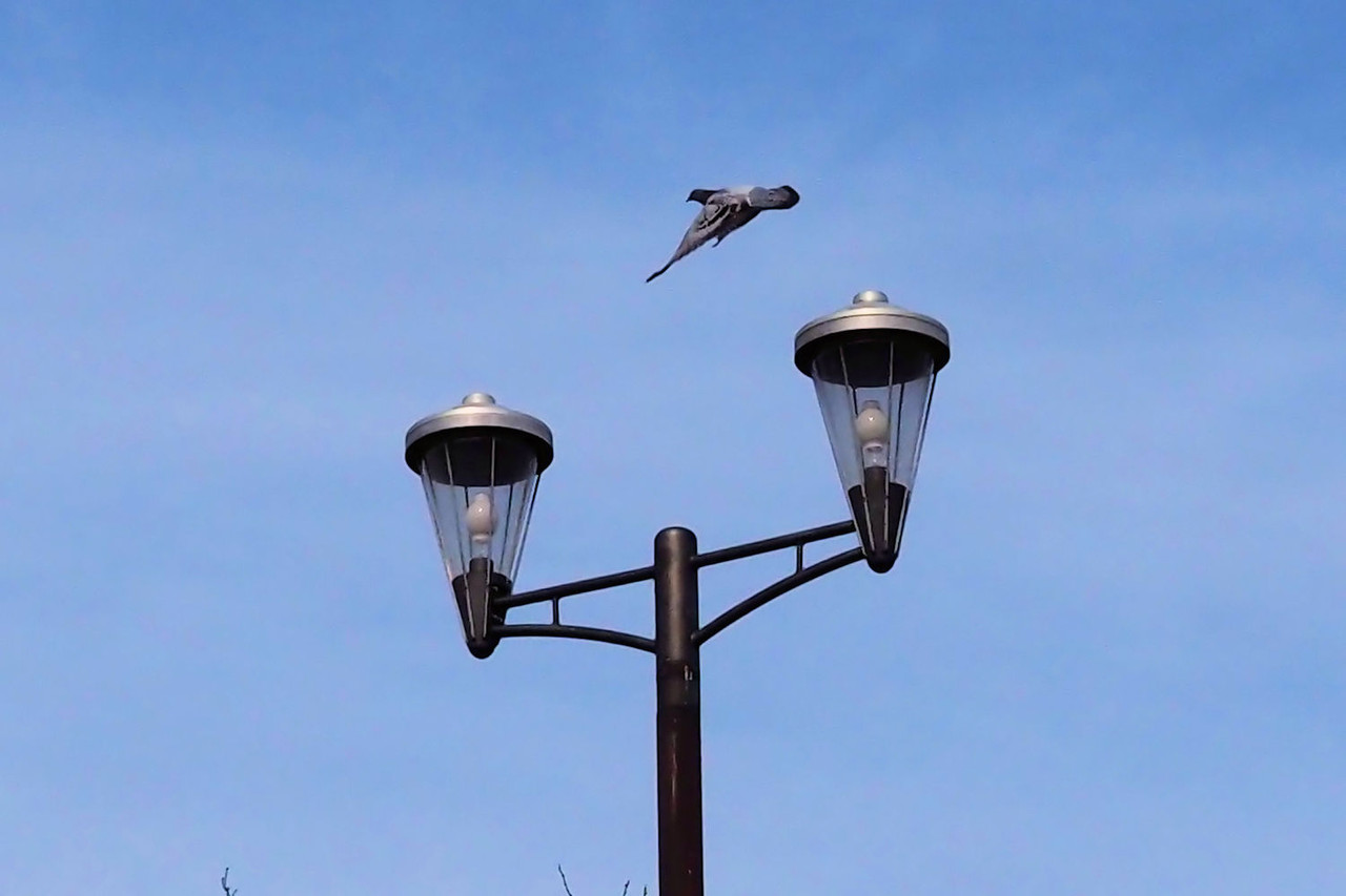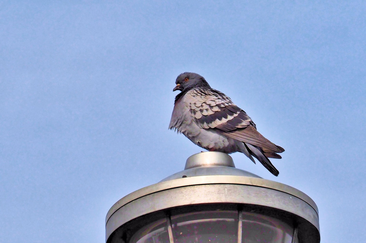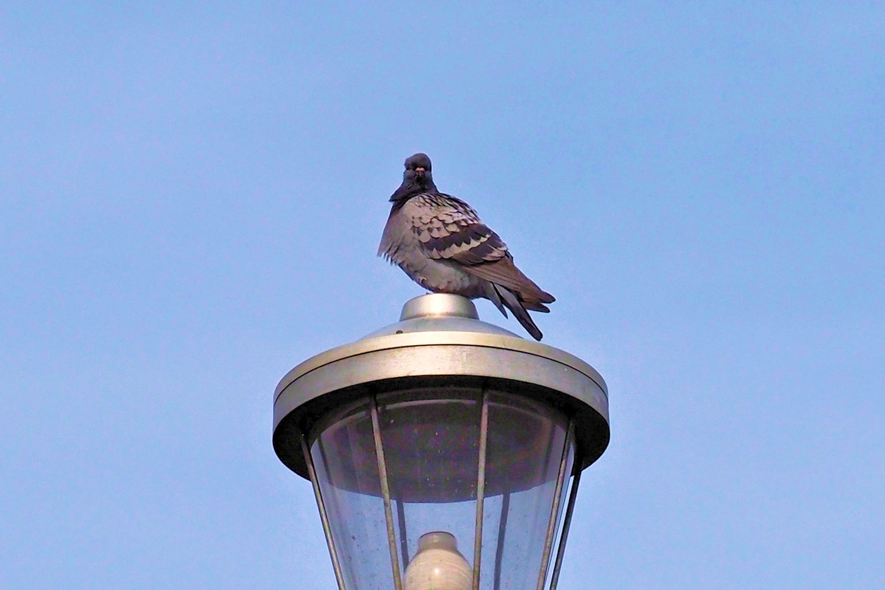 湖畔公園にある街頭の上で羽を休める鳩