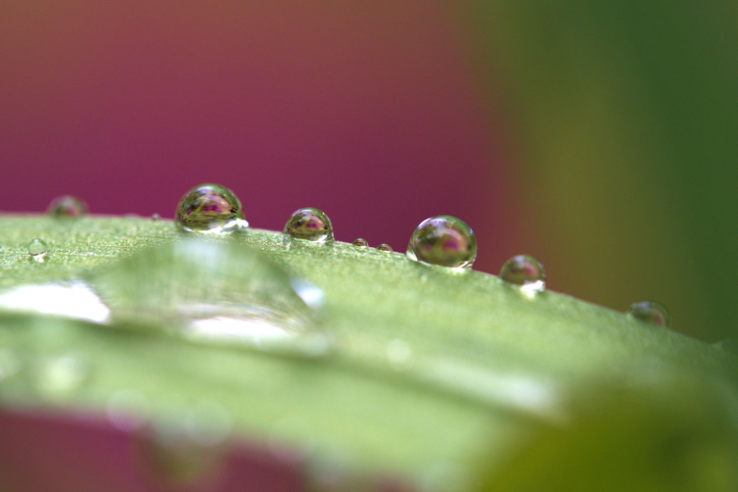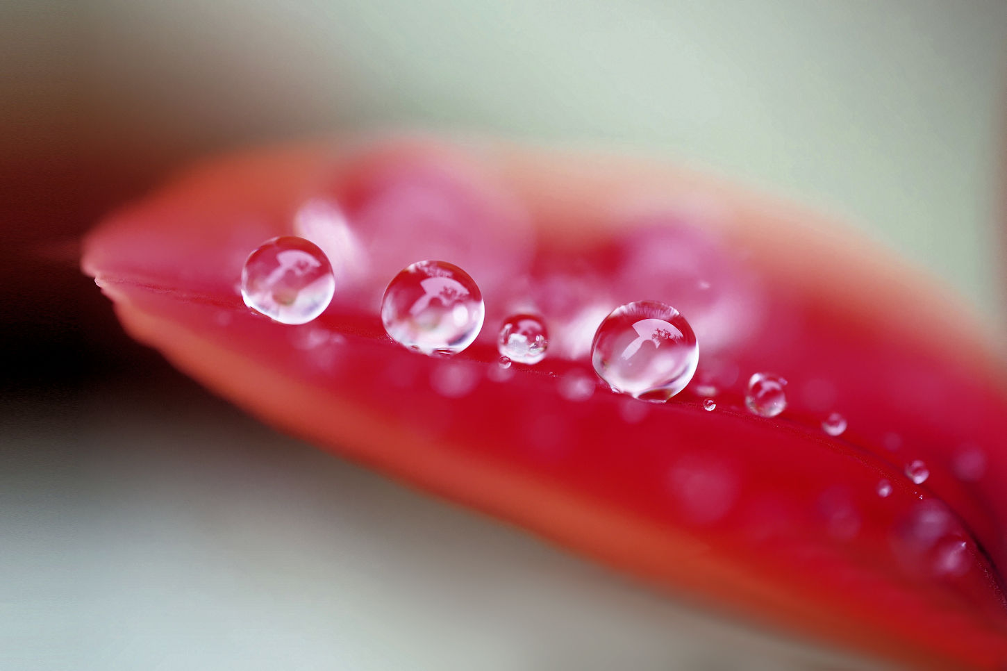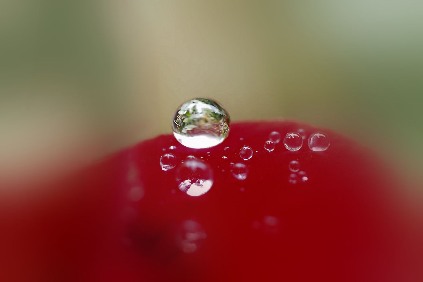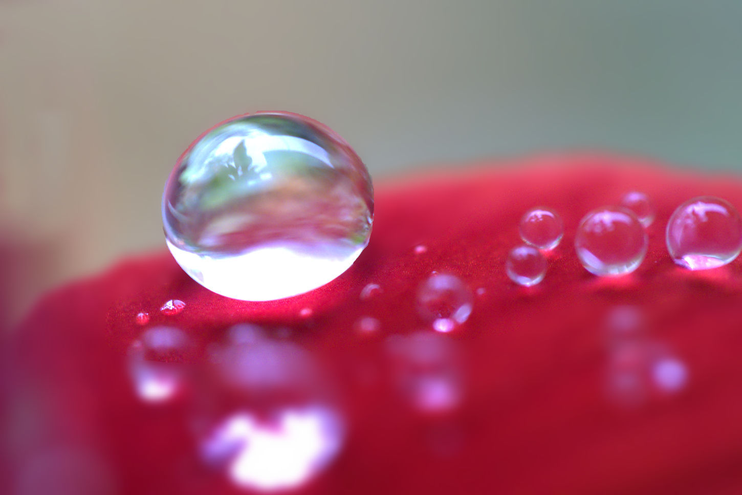 手前の大きな水滴の奥に並んだ水滴。周りの緑と背景の赤い花が写り込んでました。