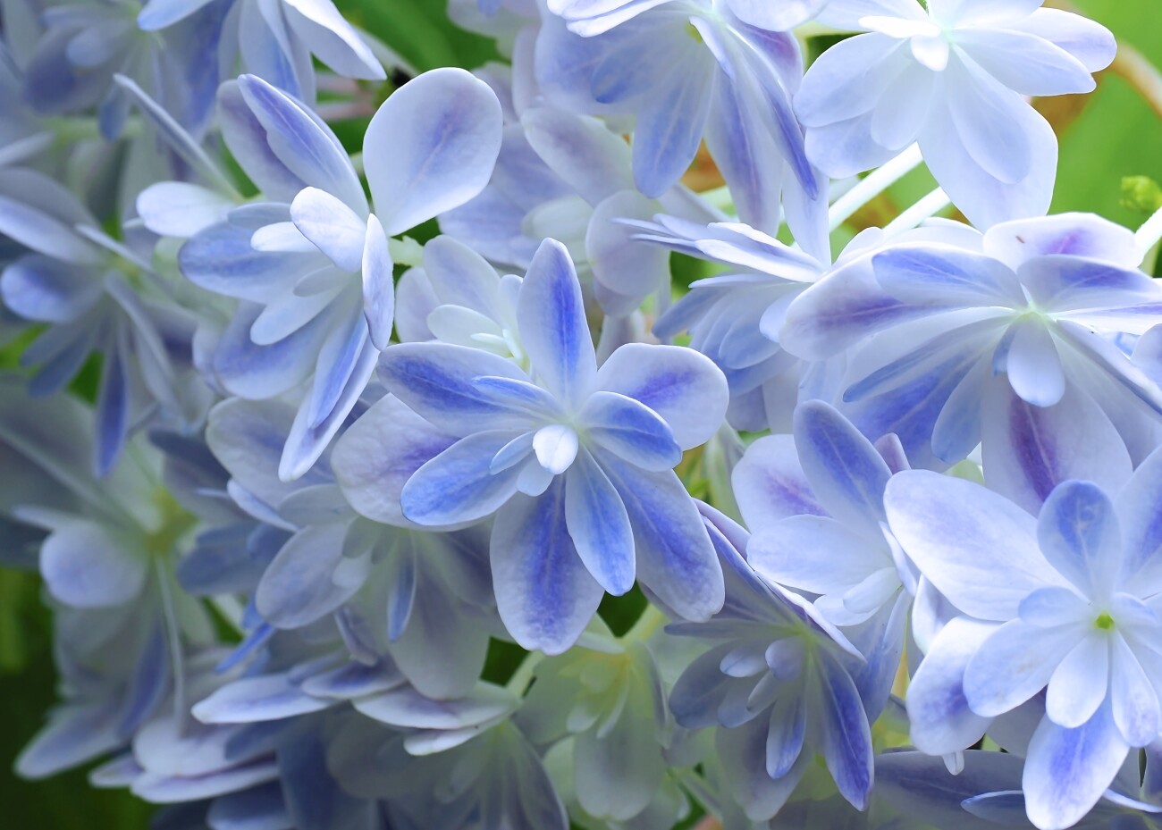 他の紫陽花より少し遅れて開花する紫陽花で、白地に爽やかなブルーのグラデーションが何ともいえない美しさを醸し出しています。