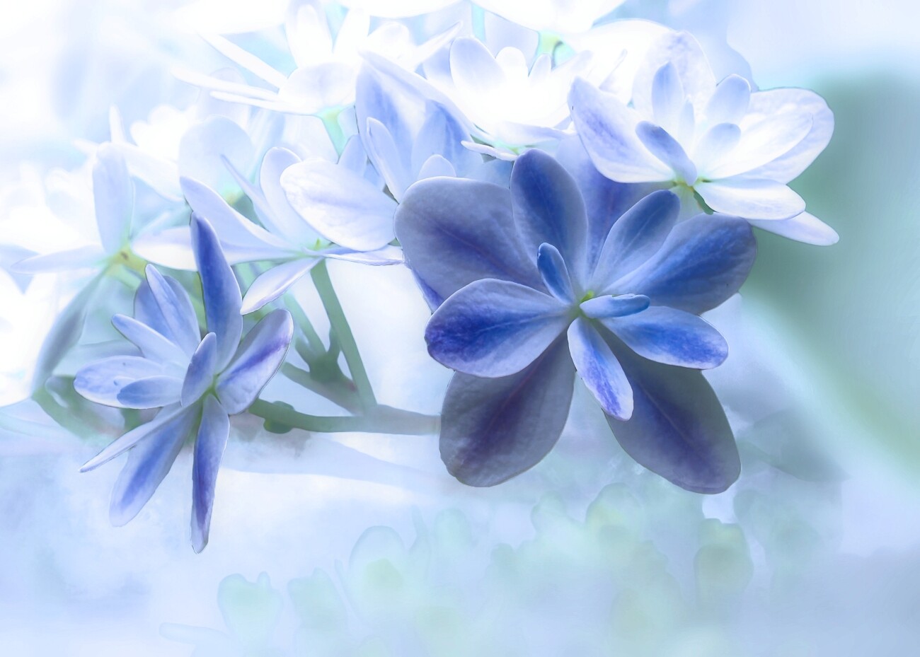 上の方のブルーのグラデーションの紫陽花は八重のようですね、新種でしょうか。