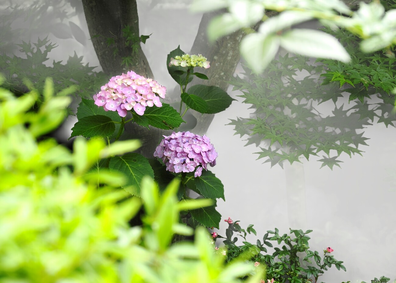 ヤマモミジの木の下でひっそりと咲くピンク系の紫陽花。