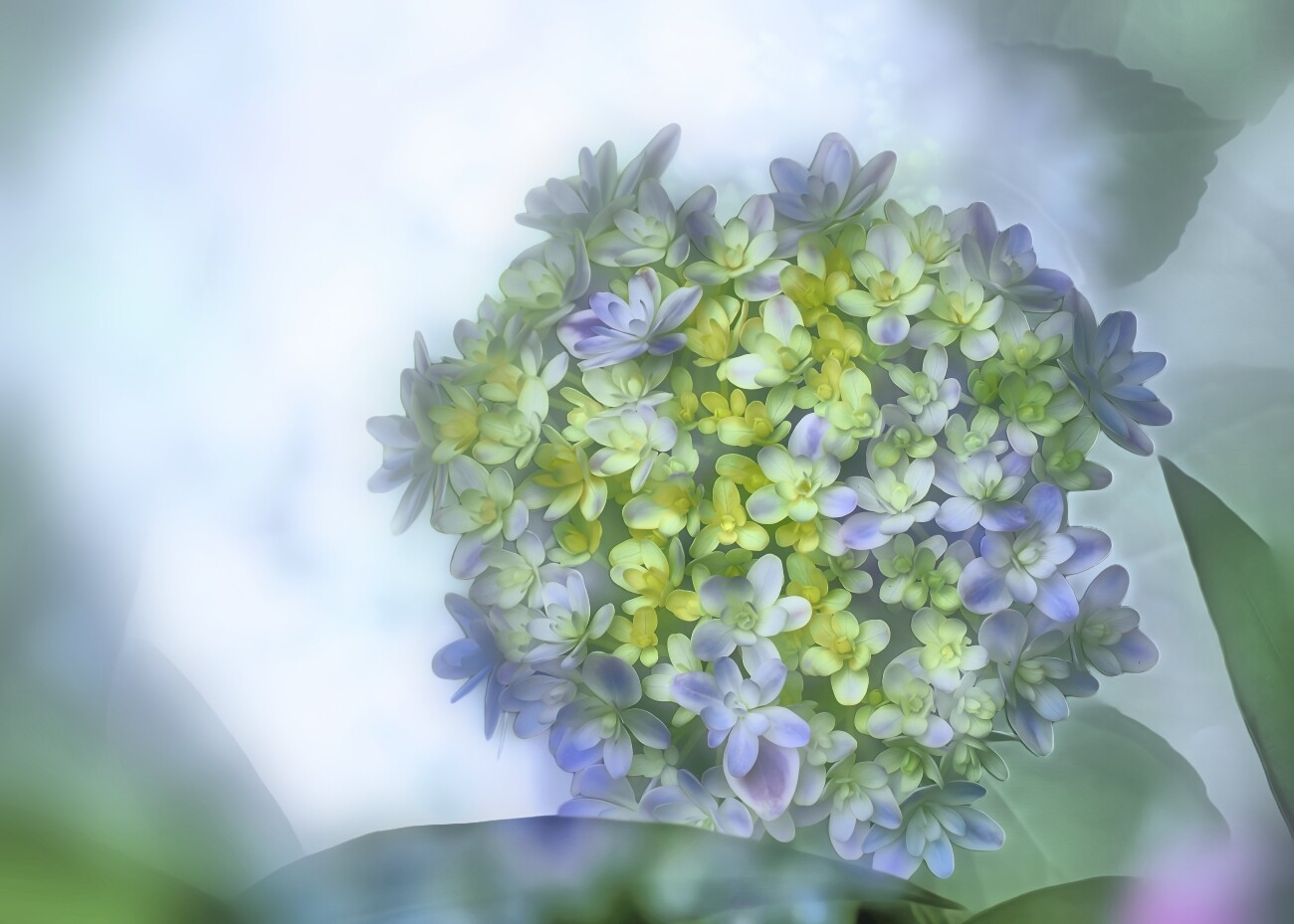 紫陽花の背後に、雨の精霊の輪郭が淡く映り込んでいるように見えたのです。