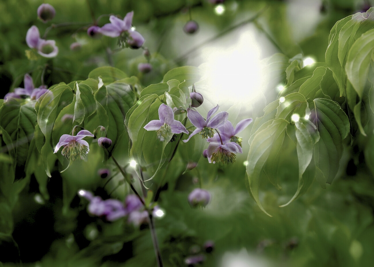 光が差し込むヤマボウシの葉を背景に、その繊細な美しさが一層際立っています。