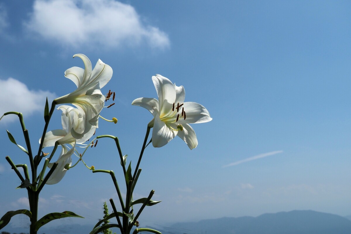 澄み渡る青空へ向かって、凜と咲く白百合の姿。