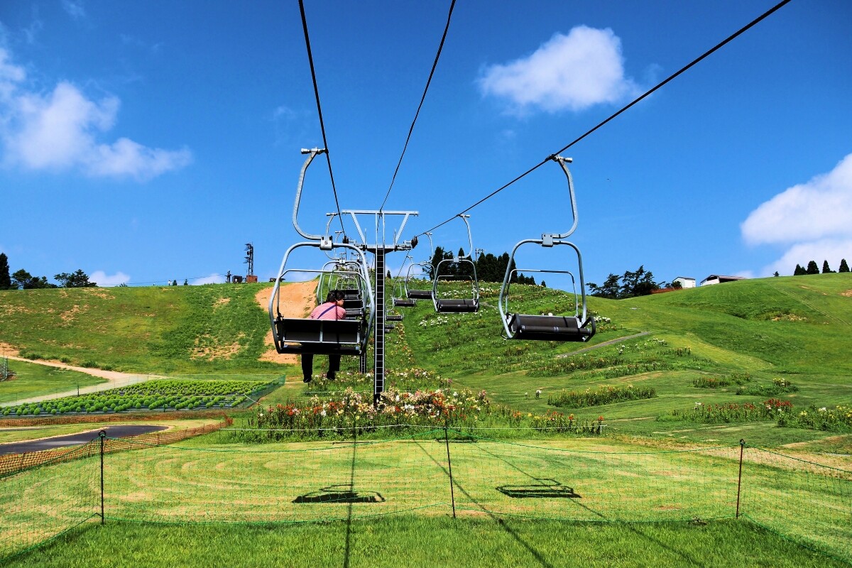 駐車場からロープウェイへ。終点でリフトに乗り継ぎ、緑の山頂を目指します。