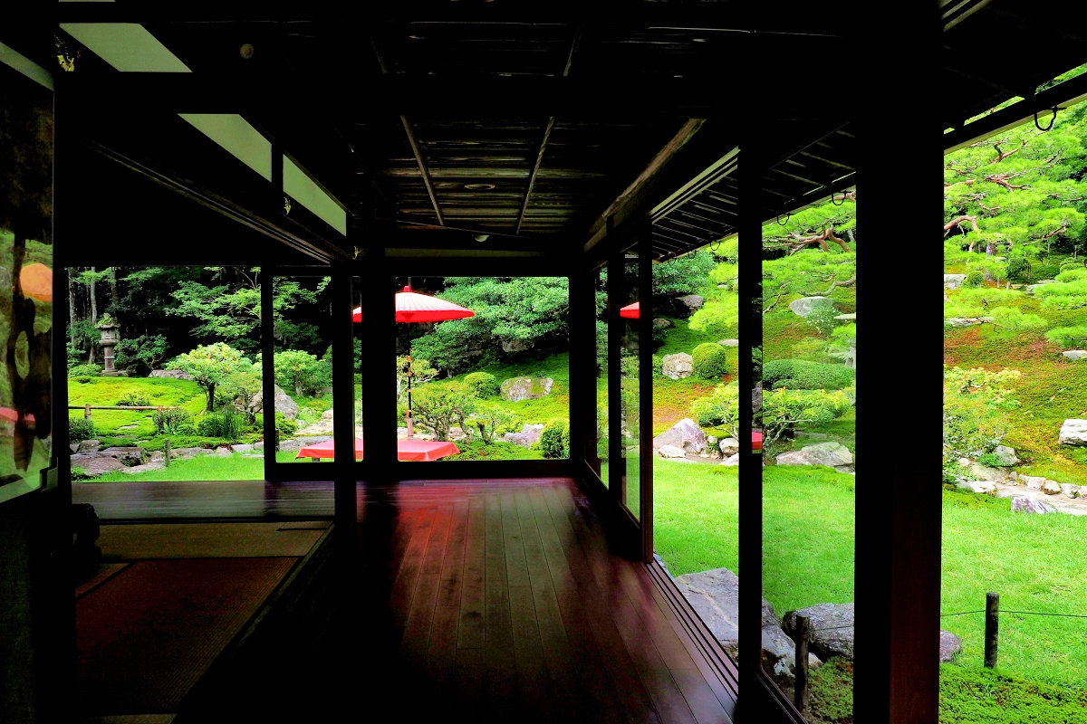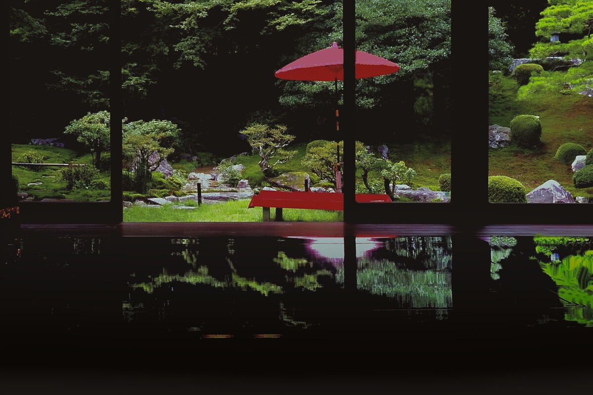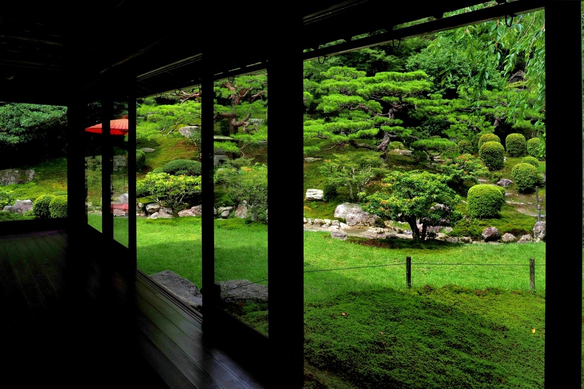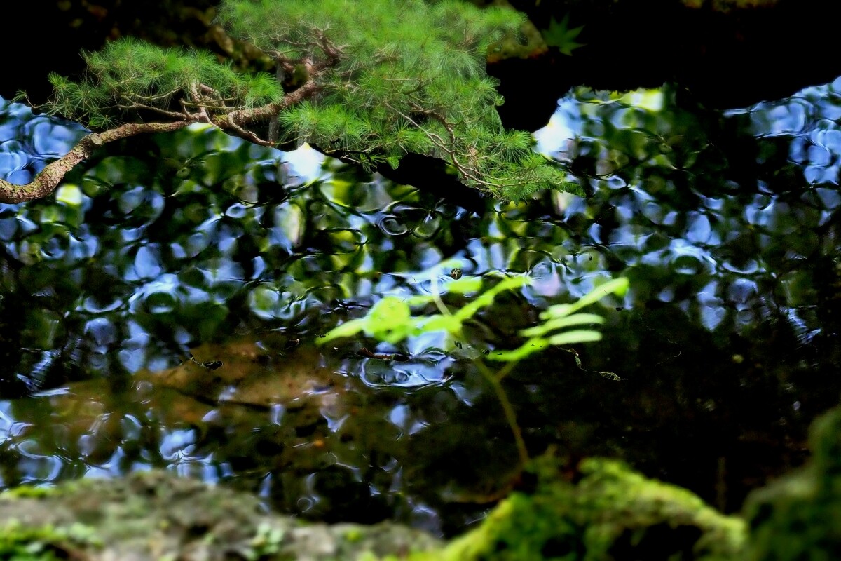 苔むした庭石や灯籠の先には、木々の枝や竹林がそよぎ、水音がひそやかに響いています。