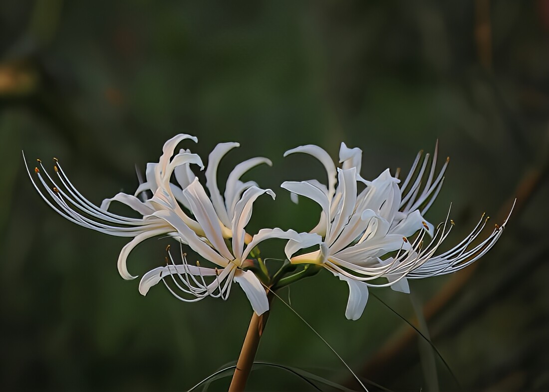 画面中央に咲く白い彼岸花は、繊細に反り返る花弁と長く伸びた雄しべが特徴的。