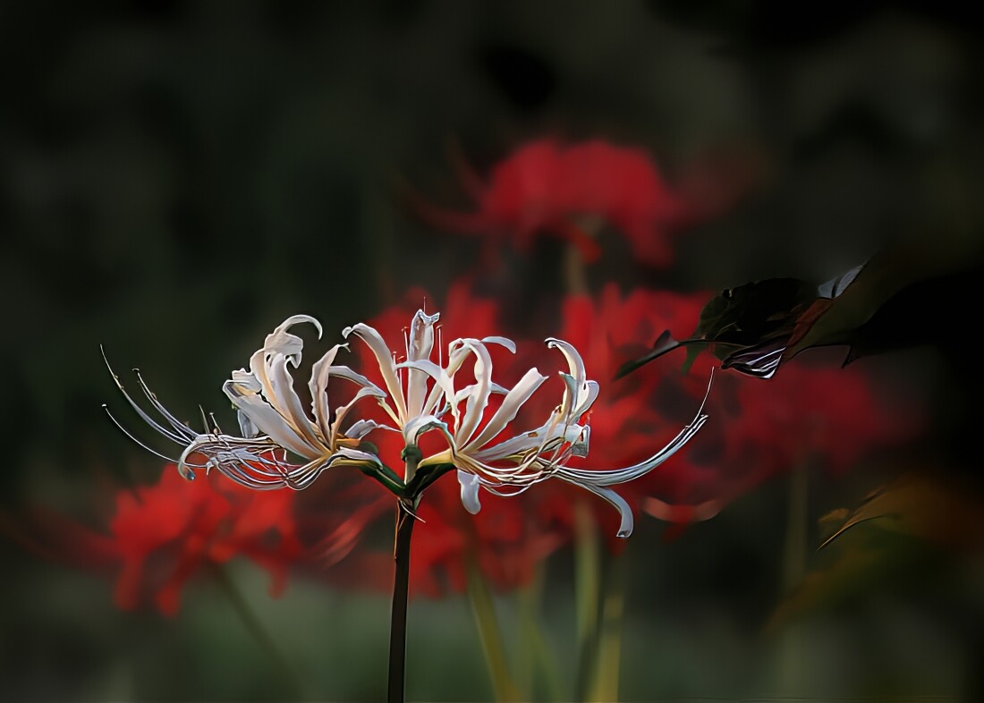 背景には赤い彼岸花がぼかされて写り込み、白の清らかさを際立たせています。