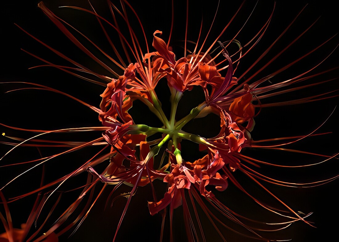 黒の背景に浮かび上がる彼岸花は、長く湾曲した花弁と放射状に伸びる雄しべが特徴的。