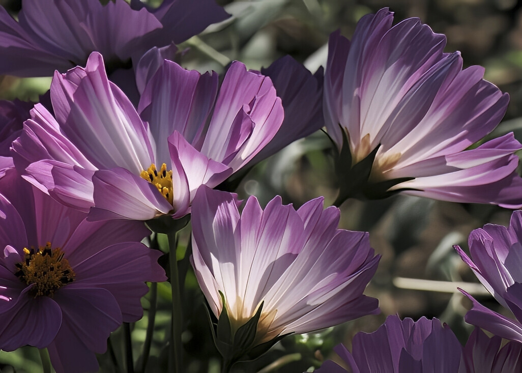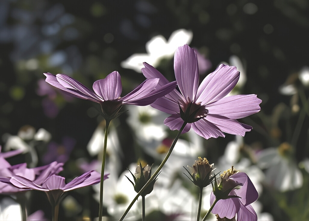 柔らかな光に包まれて、コスモスが群れ咲いています。