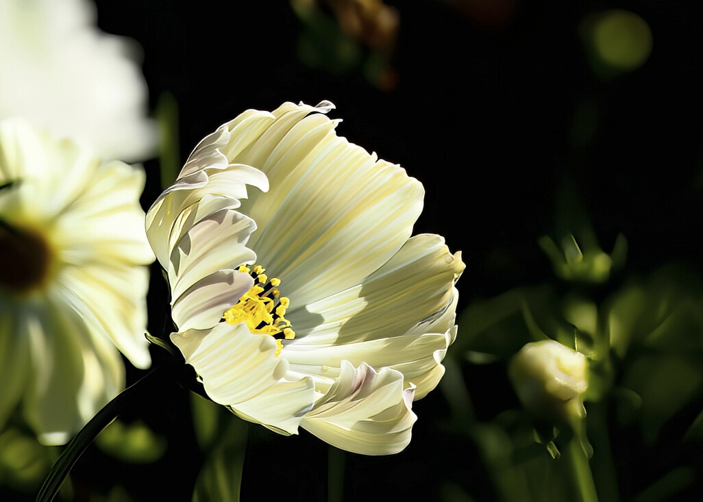 八枚の花弁は、風にそよぐ羽のように広がり、中心の黄色い花芯は、小さな太陽のように輝いています。