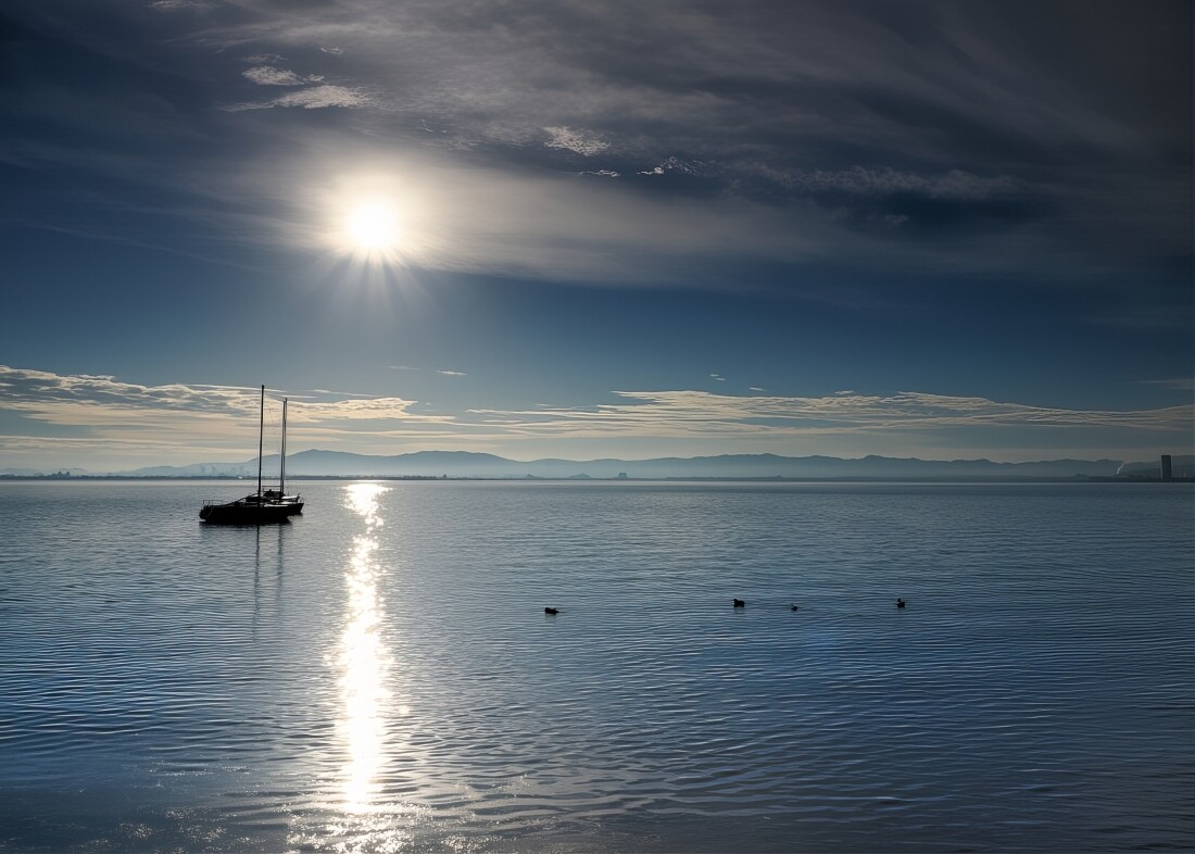 水鳥が静かに横切る中、太陽の反射が水面に広がり、ヨットの存在感を際立たせていました。