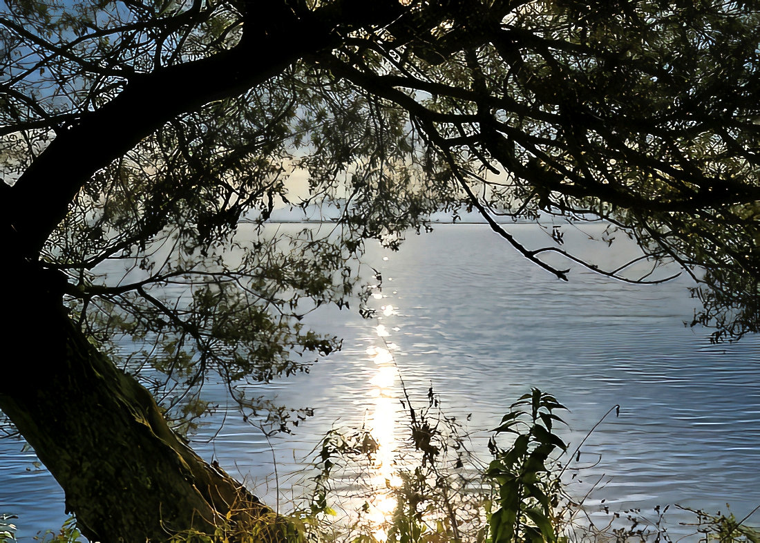 柳越しの朝陽 — 志津浜の静寂に包まれて湖岸に佇む大きな柳。