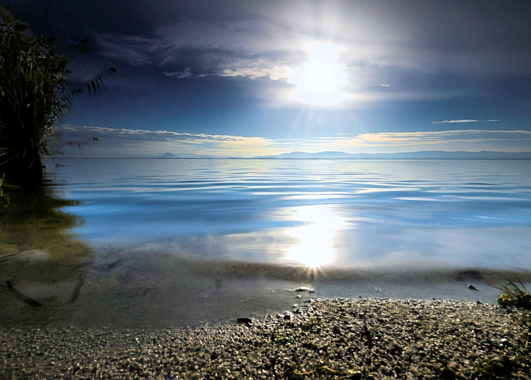 ひとりの人影もない静かな湖岸線、波ひとつない湖面に朝の光が降りそそぎ、まるで身体ごと包み込まれるような穏やかなひとときでした。