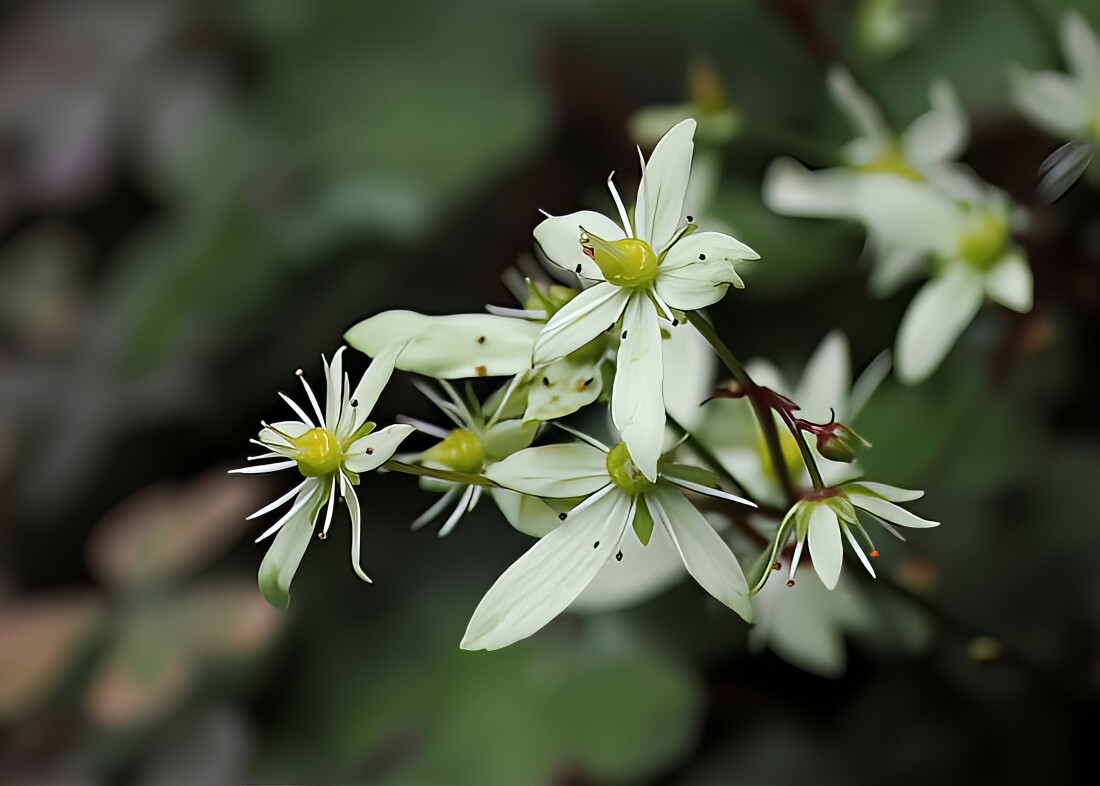 葉の間から伸びた茎の先に、白い花が並んでいます。