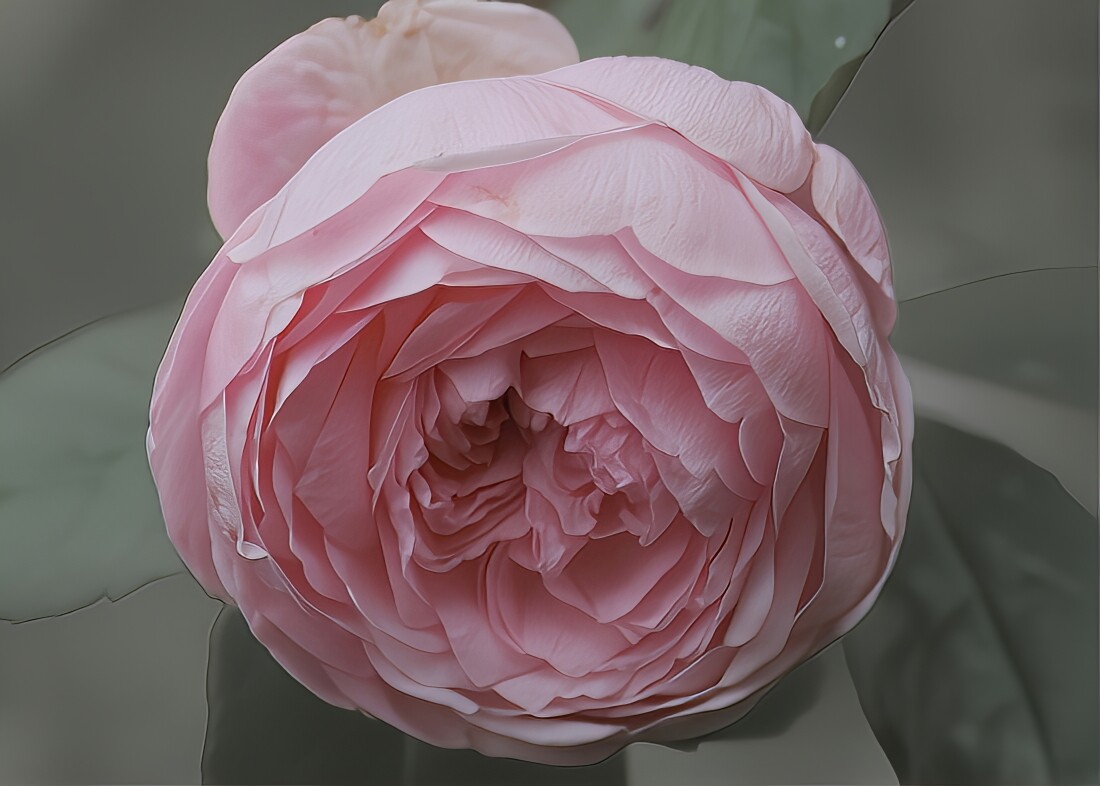 庭の片隅に咲いたピンクのバラが、曇り空の下でも明るく輝いていました。