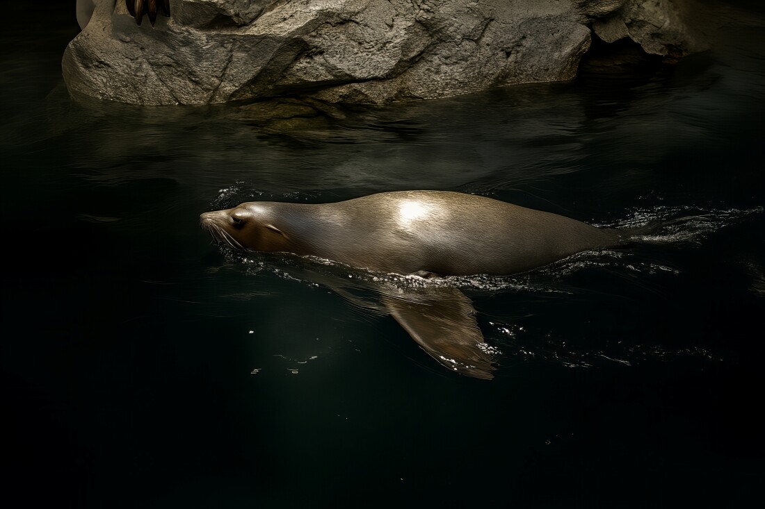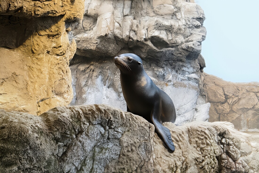 陸でくつろぐ姿に添えると、アシカの生活感が伝わります。