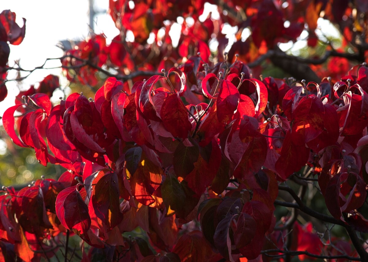 朝の光を受けて、ハナミズキの葉がまるで炎のように輝いていました。