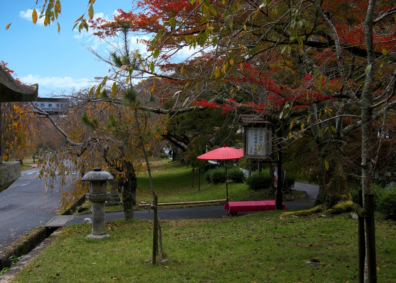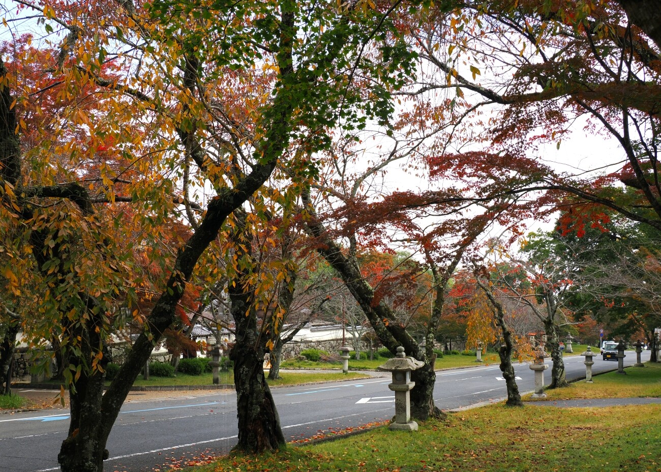 道沿いに落葉が舞い石灯籠が佇む風景にどこか懐かしさを覚えました。